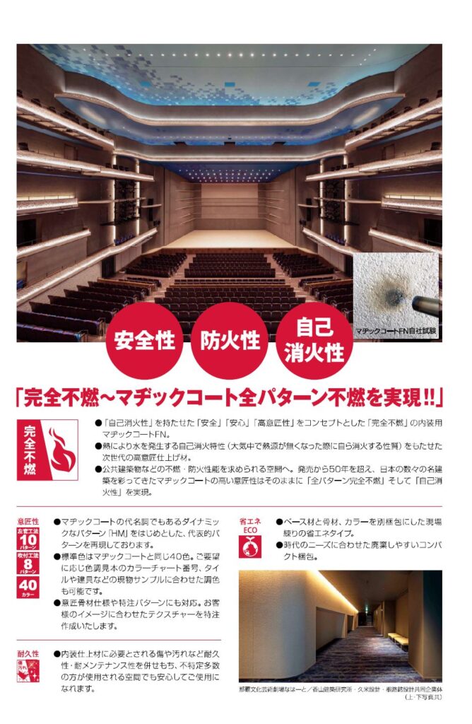 新製品マヂックコートFN(完全不燃)では、建築基準法における内装制限に適合し全パターン完全不燃はもちろんのこと、素材に自己消火性をさら併せ持たせることによって安全性を高め、多くの方々が集まる公共施設などにおいても安心してご使用できるようバージョンアップいたしました。