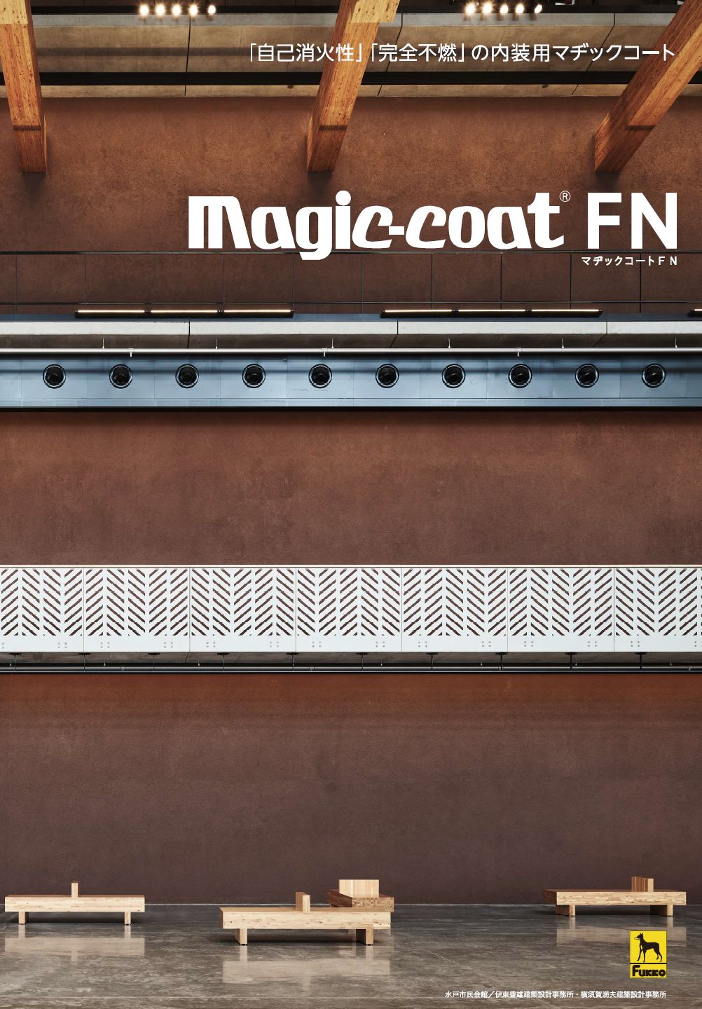 そのコンセプトは、多くの方々が集まる大空間でも外装用マヂックコート同様に発色が美しく、そしてダイナミックな意匠性を持ちながら、「自己消火性」を併せ持った、とくに安全性に特化した内装用のマヂックコートです。